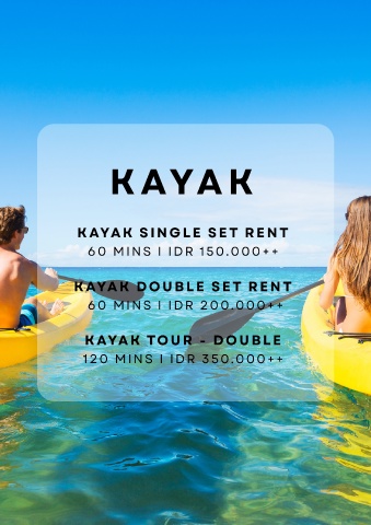 KAYAK KAYAK SINGLE SET RENT 60 MINS I IDR 150.000++ KAYAK DOUBLE SET RENT 60 MINS I IDR 200.000++ KAYAK TOUR - DOUBLE 120 MINS I IDR 350.000++