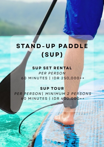 STAND-UP PADDLE (SUP) SUP SET RENTAL PER PERSON 60 MINUTES | IDR 250,000++ SUP TOUR PER PERSON| MINIMUM 2 PERSONS 60 MINUTES | IDR 400,000++
